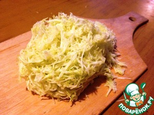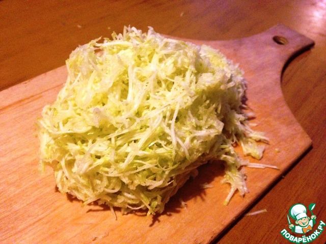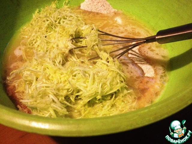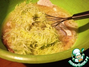 В мучную смесь ввести яично-масляную. Перемешать. Ввести кабачок и опять перемешать.