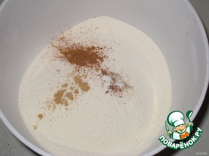 Муку просеять с разрыхлителем. Добавить пряности, перемешать.