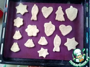Раскатываем тесто толщиной 5 мм и вырезаем при помощи формочек фигуры. Выкладываем печенье на противень, застеленный пекарской бумагой (у меня коврик). Выпекать 20-25 минут при 180*. По истечении времени дать остыть.