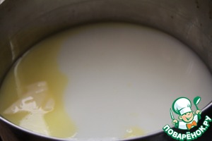 Налить воду в кастрюлю (примерно наполовину), закипятить. Добавить молоко и масло.