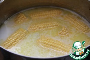 Добавить кукурузу и уменьшить огонь. Варить до готовности. Если кукуруза безвкусная, можно добавить немножко сахара.