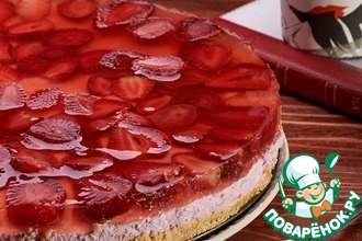 В раздвижную форму выкладываем бисквит, пропитываем, потом крем, бисквит и ставим в холодильник для застывания на несколько часов. Выкладываем клубнику, смазывам желе, бока посыпаем фисташками. Подробно можно посмотреть в коротком видео