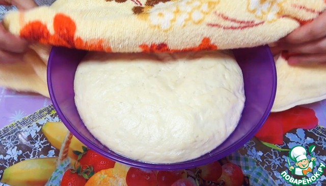 Накрываем миску полотенцем (можно пищевой пленкой) и оставляем тесто для подъема. Оно будет готово к использованию уже через 30 минут, но лично я даю ему на подъем примерно час.