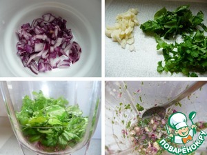 Измельчить чеснок и зелень. Все поместить в чашу блендера, влить оливковое масло (может потребоваться масла и больше, зависит от сорта картофеля) или любое, вами любимое, добавить соль и слегка взбить. -