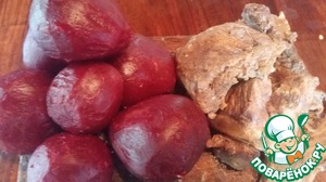 Готовую свеклу остудить под холодной водой и натереть на крупной терке. Мясо отделить от костей, удалить жилки и фрагменты жира, и порезать небольшими кусочками.