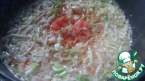 Поэтапно добавляем картофель, квашенную капусту, а через 10 минут свежую капусту, черешковый сельдерей, помидор и болгарский перец.