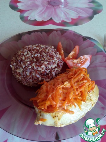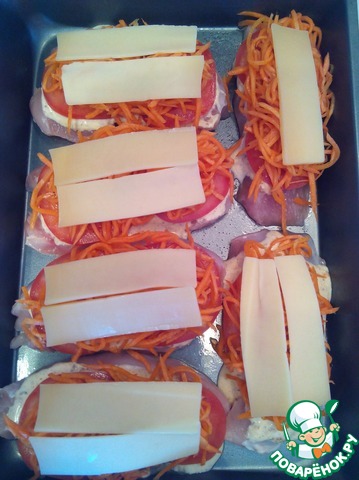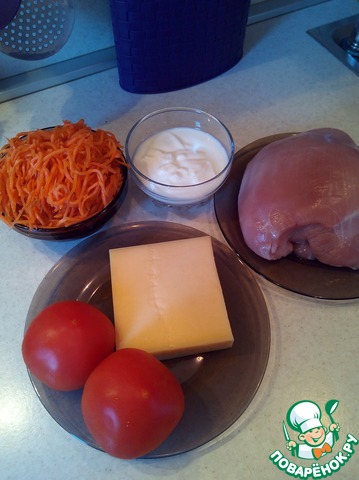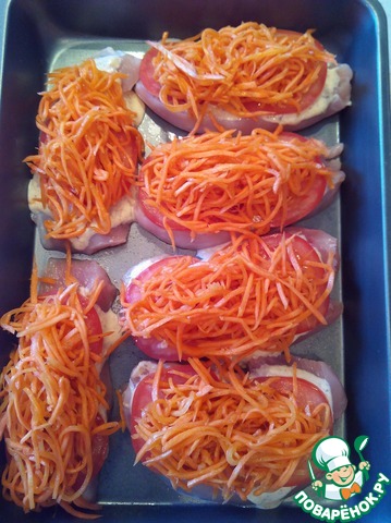 Сверху выложить нарезанный кружочками помидор, корейскую морковь.