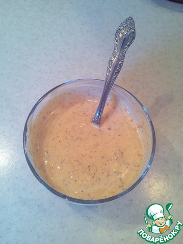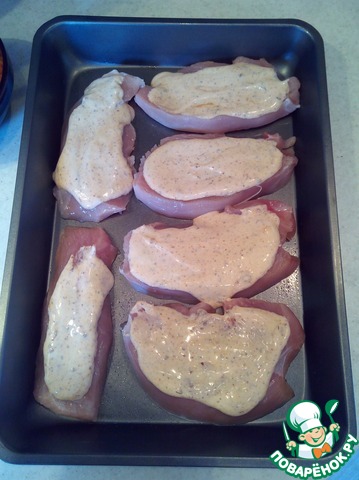 Филе индейки нарезать, выложить в форму, обильно смазать соусом.