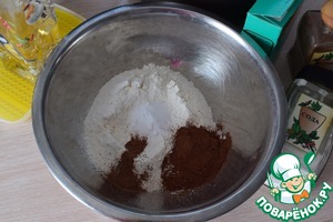 Все очень просто: смешиваем в миске просеянную муку, соду, корицу и какао-порошок.