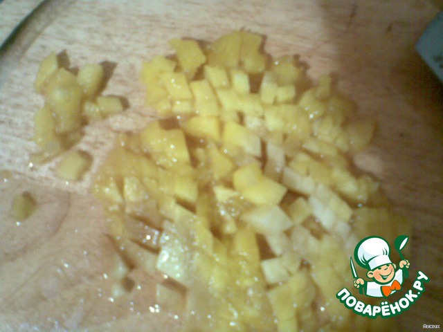 Kусочки ананаса, вымоченные в персиковом соке, порезать на кубики.