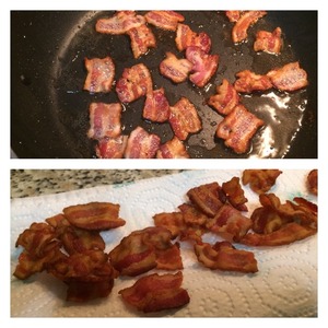 • Бекон нарезать на кусочки примерно 2 см, обжарить на сухой сковороде.