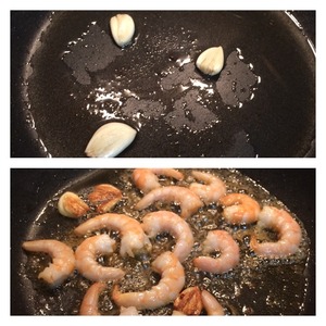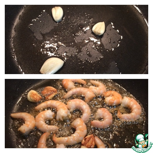 • На этой же сковороде обжарить сначала раздавленные зубчики чеснока, затем очищенные креветки, убрав чеснок, буквально 1 минуту.