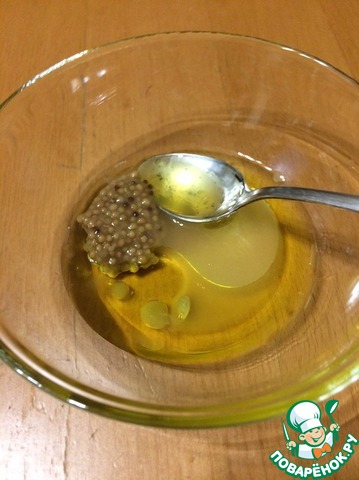 • Приготовить заправку из масла, лимонного сока и горчицы.