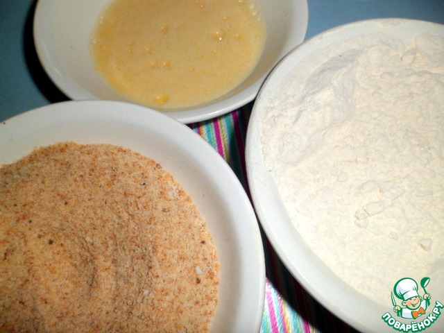 Подготовить три блюдечка. Мука, сухари, взбитые яйца. Я по одному взбивала, не сразу три. Яйца разные.