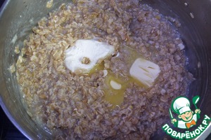 Довести до кипения воду в большой кастрюле и всыпать хлопья. Уменьшить нагрев и варить около пяти минут, пока на поглотится жидкость. Добавить половину масла и половину сыра, расплавить и размешать.