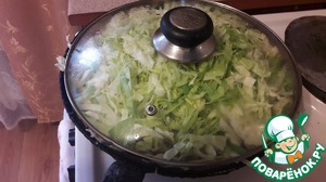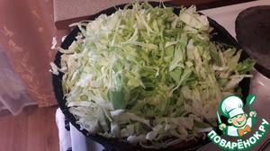 Как только мясо достигнет нужного нам состояния, добавляем шинкованную капусту. Желательно все готовить в сковороде с высокими бортиками.
