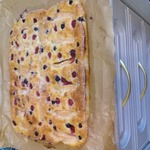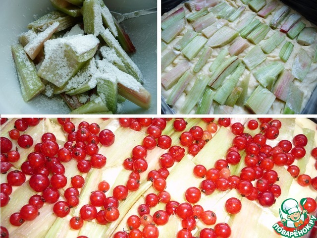 На тесто выложить ревень (пересыпанный крахмалом), можно слегка вдавить. Сверху выложить красную смородину или другую ягоду.