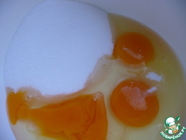 В чаше взбить миксером яйца с сахаром и ванильным сахаром в пышную пену.
