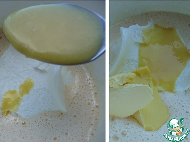 Добавить мягкий творог, влить ликер, мягкое сливочное масло, взбить.