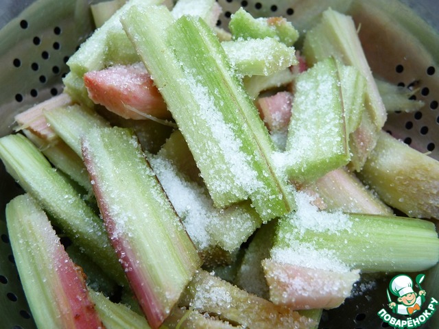 Ревень почистить, снять грубые части, нарезать небольшими дольками, засыпать сахаром и оставить (я оставила на ночь), чтобы ушел лишний сок. Сок использовала для компота.