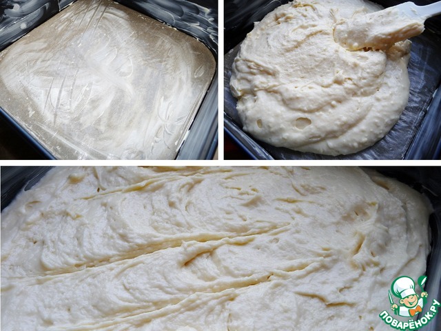 Разъемную форму (размер 24х24см) застелить пекарской бумагой, смазать дно и стенки маслом, распределить тесто по форме, разровнять.