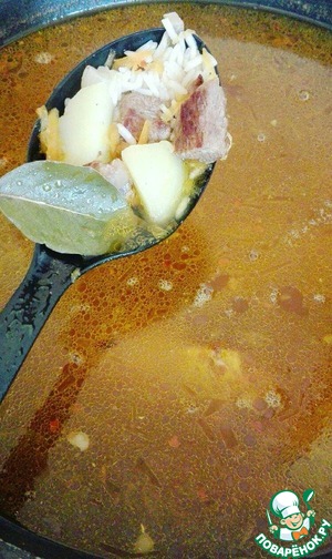 Заливаем все водой, даём закипеть и закидываем картофель, солим и перчим (по желанию острый перчик), варим минут 15, следом закидываем рис и лавровый лист, даём закипеть и ставим на медленный огонь и оставляем на минут 15, после выключаем и даём постоять.