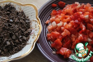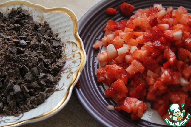 Подготовить клубнику (нарезать маленькими кубиками) и шоколад (порубить не очень мелко)