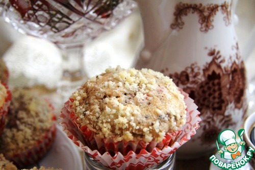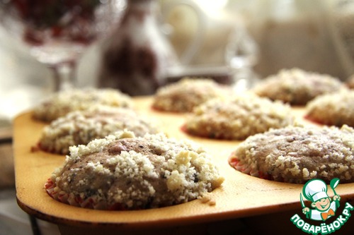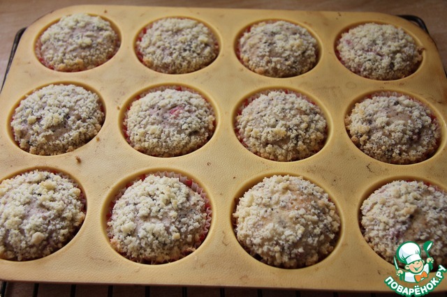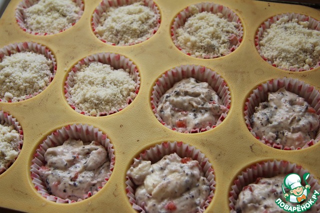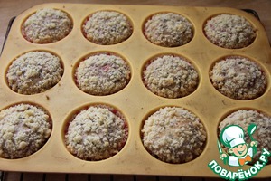 В форму для выпечки вложить бумажные капсулы и наполнить их на 2/3 тестом, сверху выложить по ложечке штрейзеля.