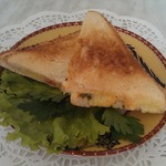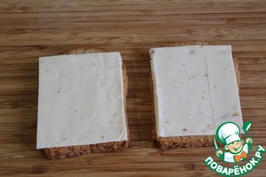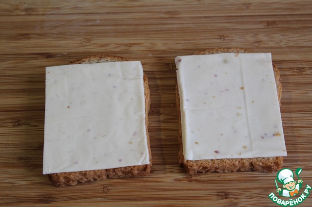 На один кусок выложить начинку, закрыть вторым куском так, чтобы начинка оказалась между сыром.