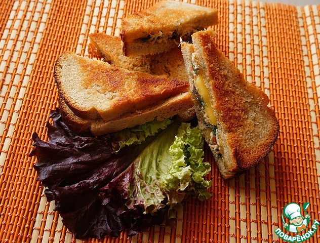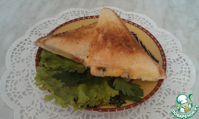 Разрезать сэндвич по диагонали и обжарить на гриль-сковороде с двух сторон до расплавления сыра. -