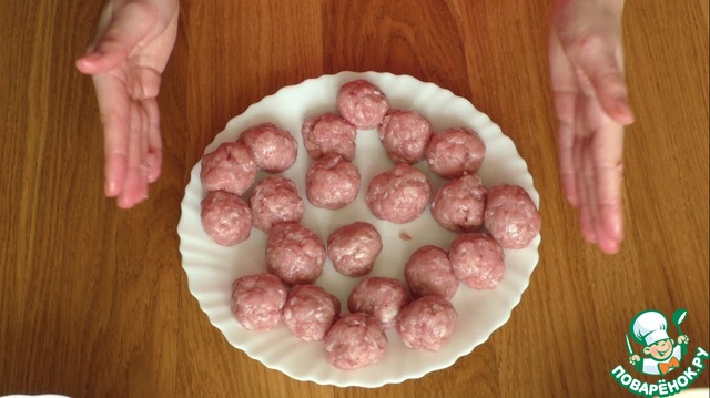 Пока вода закипает, займитесь приготовлением фрикаделек. Для этого, посолите и поперчите фарш по вкусу и слепите из него фрикадельки. -