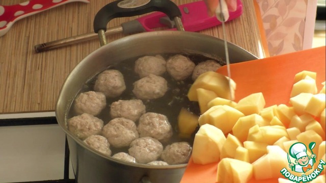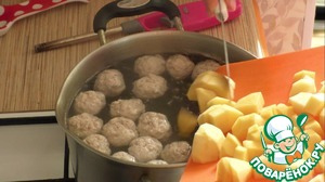 Картофель почистите, нарежьте кубиками и добавьте в кастрюлю к фрикаделькам.