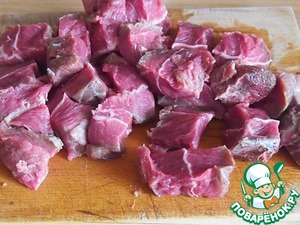 Пока варится перловка, мясо нарезать на кусочки.