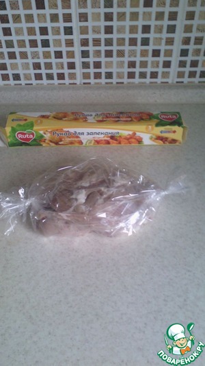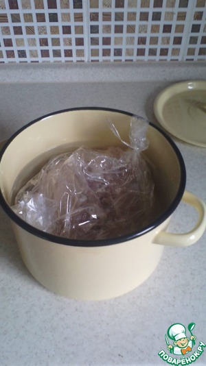 Поместите мясо в рукав для запекания. С двух сторон герметично завяжите рукав клипсой для закрывания. Поместите в большую кастрюлю, залейте холодной водой. -