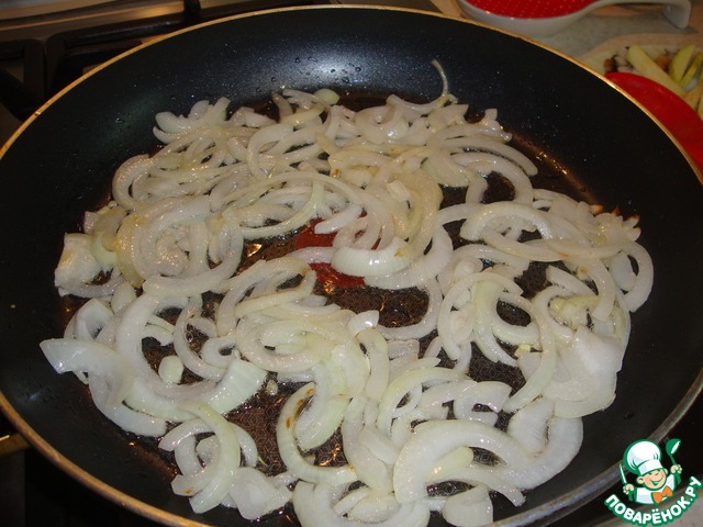 • Обжарить на сковороде слегка лук.