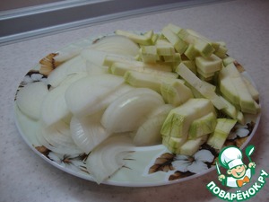 • К луку добавить кабачок и обжарить до полуготовности.