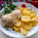 Мой вариант: брала бедрышки, они поменьше, как раз на порцию. И делала не дырочки в мясе, а просто распределила сыр с чесноком под шкуркой. Во второй раз готовила не отдельно в фольге каждую порцию, а в большой форме по тому же принципу, сначала картошечка, сверху курочка.