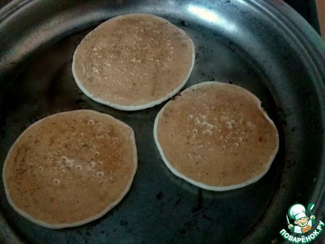Далее очень хорошо разогреваем сковороду. Выпекать панкейки как обычно: на сухой сковороде, до пузырьков. Перевернуть, подрумянить с обратной стороны.