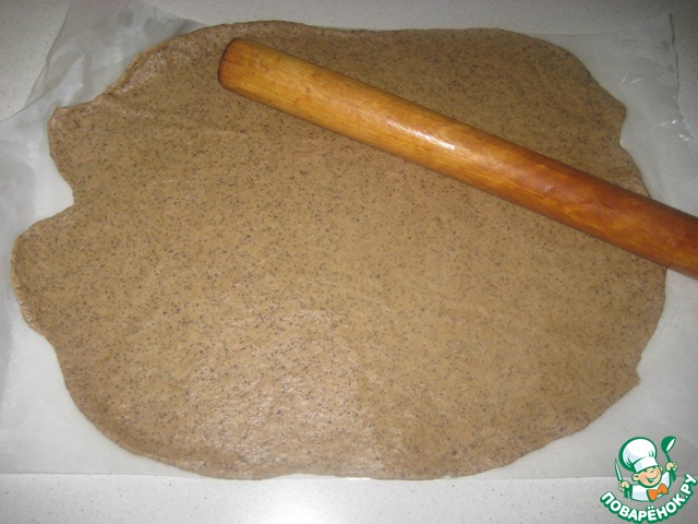 На листе бумаги для выпечки раскатать тесто в тонкий пласт.