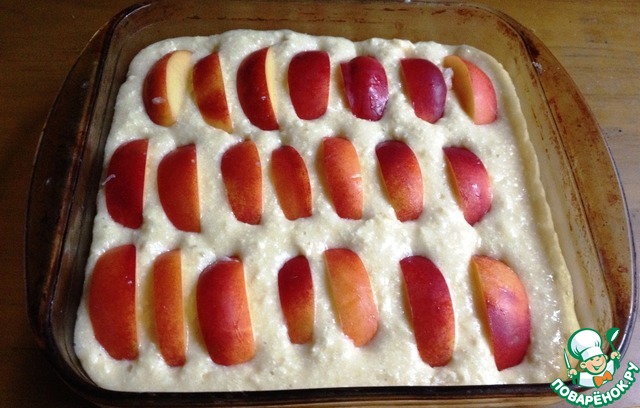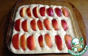 Ломтики выложить поверх теста немного утопив. Поставить в разогретую духовку.