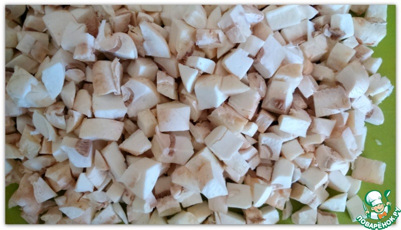 Измельчите чеснок и нарежьте шампиньоны небольшими кубиками.