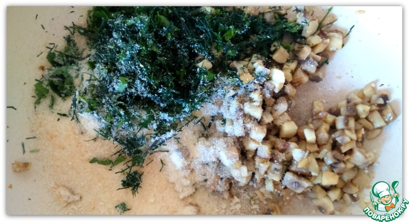 Соедините хлебные крошки или панировочные сухари с зеленью и шампиньонами