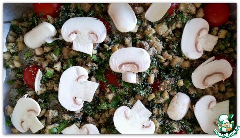 Выложите на рыбу панировочную смесь, черри и довершите композицию несколькими ломтиками грибов и сливочного масла сверху.