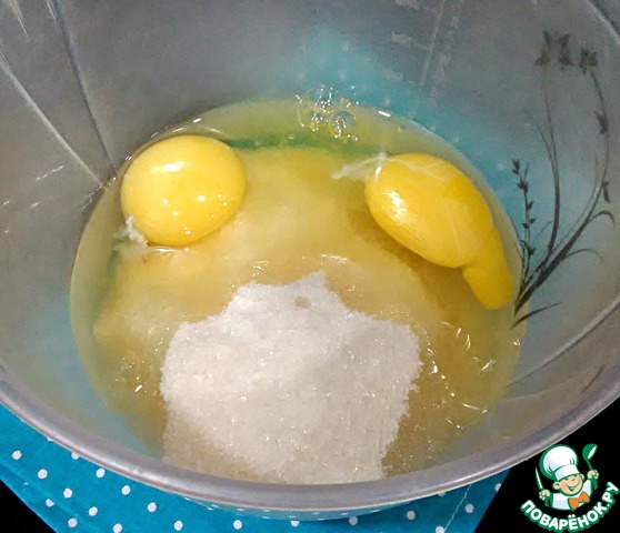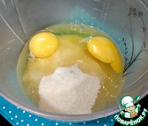 Яйца соединить с сахаром и взбивать минуты 3.