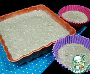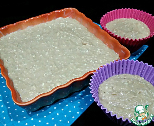 Тесто распределить по формочкам на 2/3. У меня форма 20х20, мне ее не хватило и я дополнительно использовала 2 силиконовые. Выпекать в заранее разогретой духовке при температуре 180 градусов 40-50 минут, ориентируйтесь по своей духовке. Мне хватило 45 минут. Готовность проверьте сухой зубочисткой.