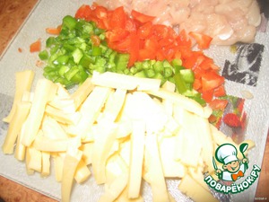 Вместо курицы можно взять отварное мясо, колбасу варенную, сосиски, ветчину. Вместо перца - морковь, можно и лук положить.
