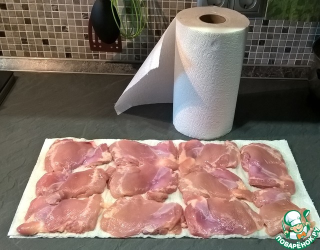 • Подготовить мясо - обрезать все лишнее, промыть и обязательно (!) хорошо просушить. Части курицы можно брать любые, нам больше нравятся бедра без костей.