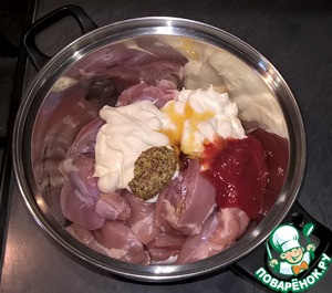 Мясо нарезать на порционные куски (я просто разрезаю бедро на 2 части), уложить в удобную для размешивания посуду, добавить майонез, горчицу, кетчуп и мед. Все хорошо перемешать. Если маринад густо, можно добавить немного сливок.