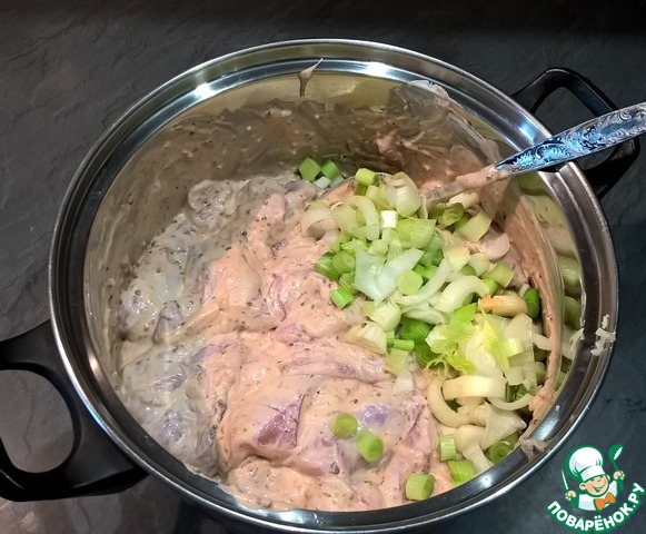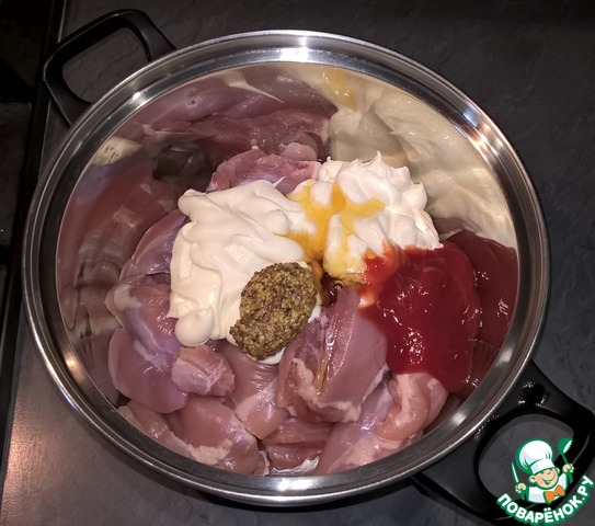 • Мясо нарезать на порционные куски (я просто разрезаю бедро на 2 части), уложить в удобную для размешивания посуду, добавить майонез, горчицу, кетчуп и мед. Все хорошо перемешать. Если маринад густо, можно добавить немного сливок.