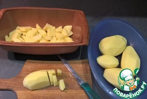 • Подготовить форму для запекания с высокими бортами (у меня утятница 24х12х7, количество продуктов подобрано под нее). Можно кисточкой смазать форму растительным маслом. Почистить и порезать картофель небольшими дольками (шайбами, слайсами, кубиками - главное, не очень крупно). Картофель присолить и поперчить (я солю в два слоя, т. к. картошки много), можно посыпать любимыми специями (у меня сегодня обычная приправа для картофеля).